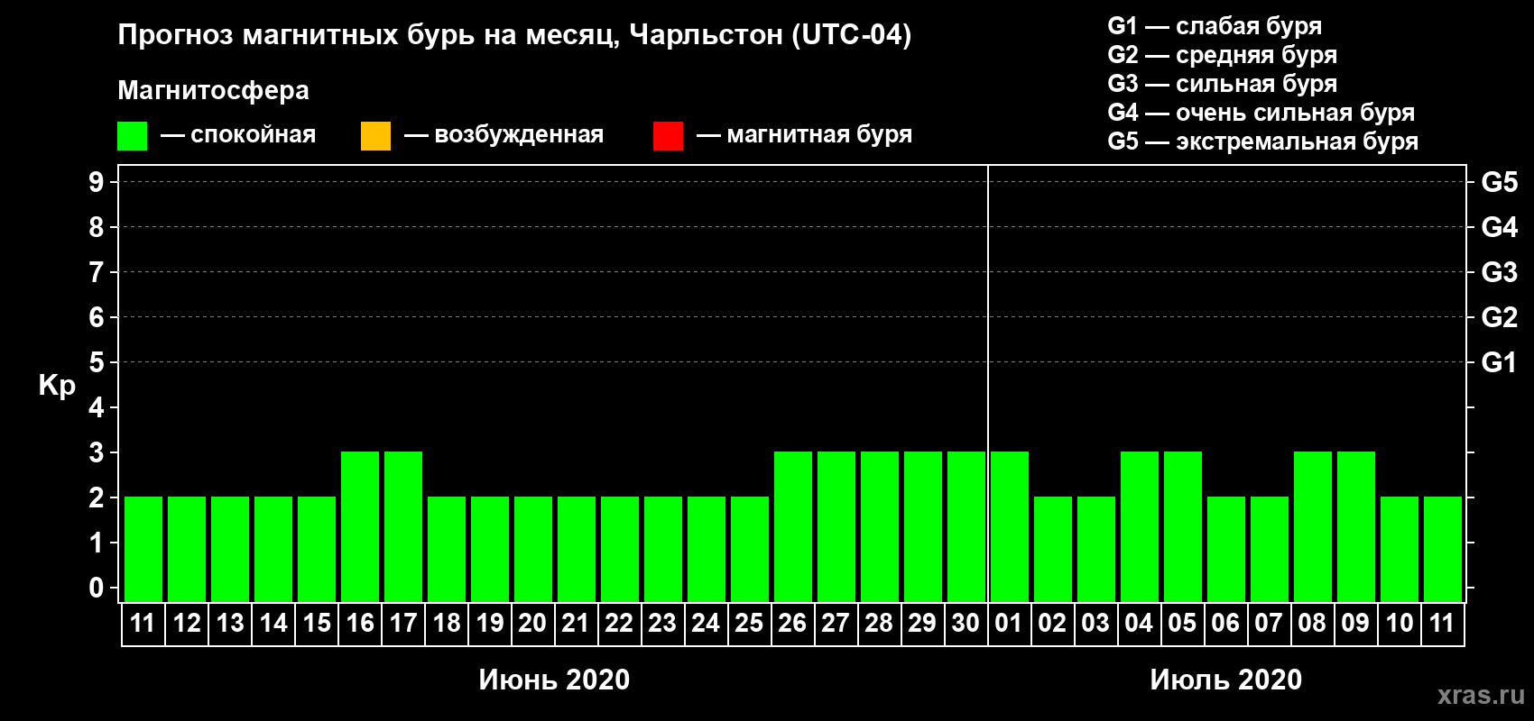 Прогноз магнитных бурь в Чарльстоне на 11 июня 2020 года