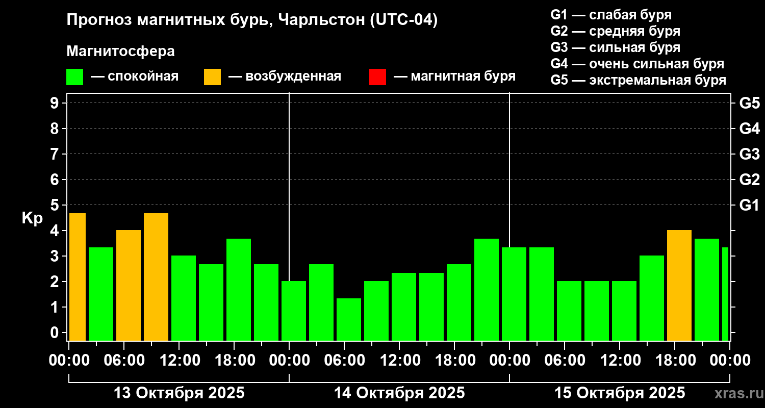 Прогноз магнитных бурь в Чарльстоне на 13 октября 2025 года
