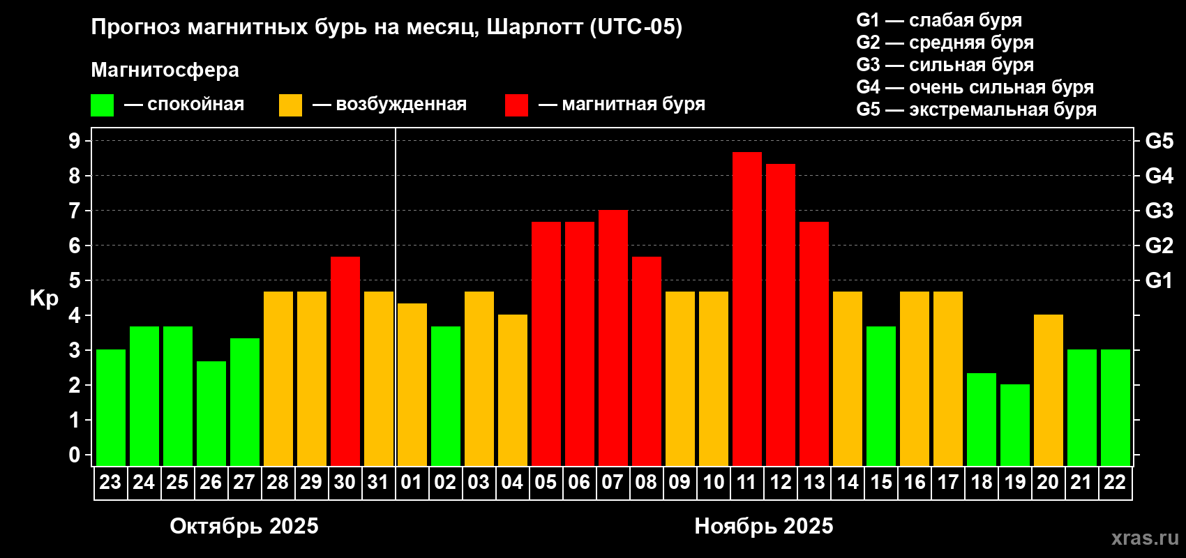 Прогноз магнитных бурь в Шарлотте на 23 октября 2025 года