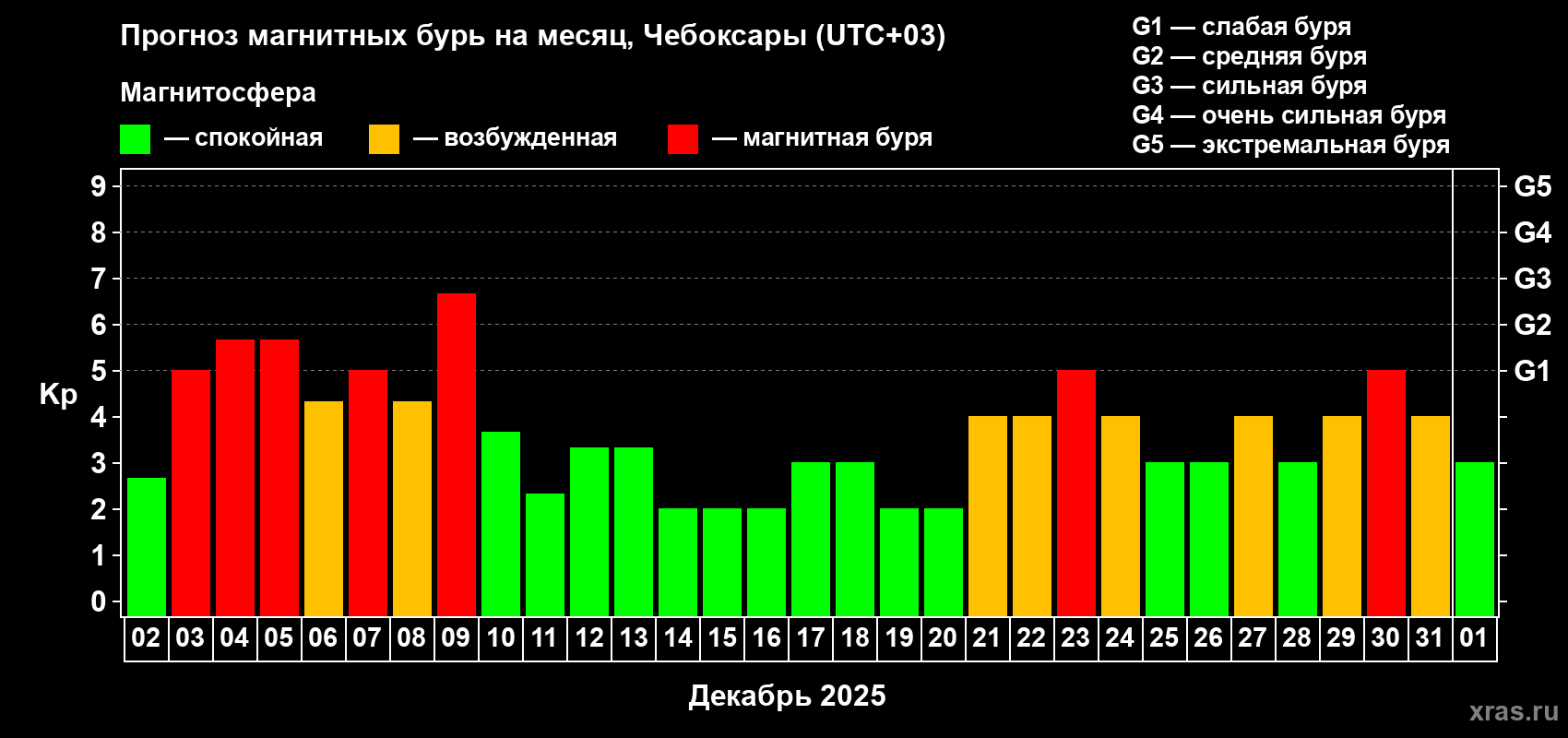 Прогноз магнитных бурь Чебоксарах на 2 декабря 2025 года