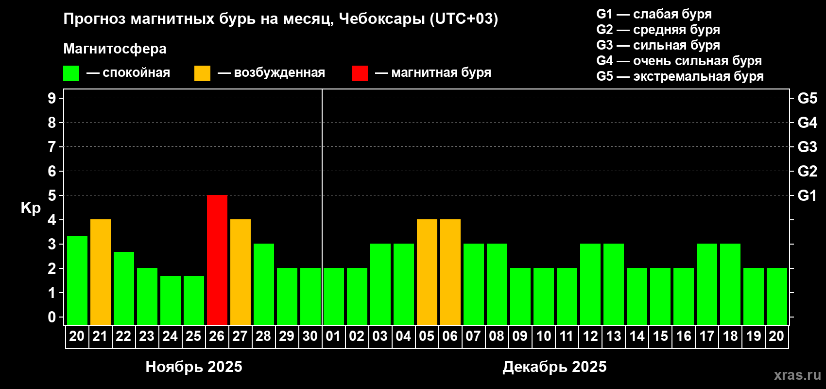 Прогноз магнитных бурь Чебоксарах — 20 ноября 2025 года