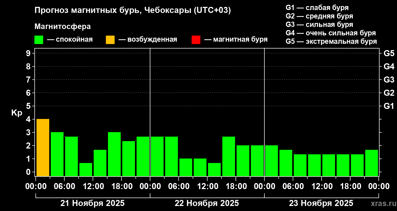 Прогноз магнитных бурь Чебоксарах — 21 ноября 2025 года