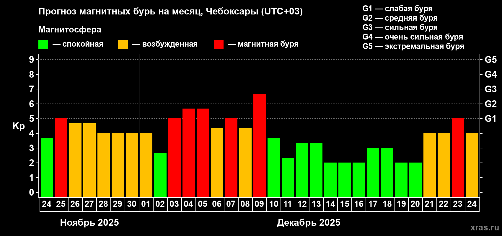 Прогноз магнитных бурь Чебоксарах — 24 ноября 2025 года