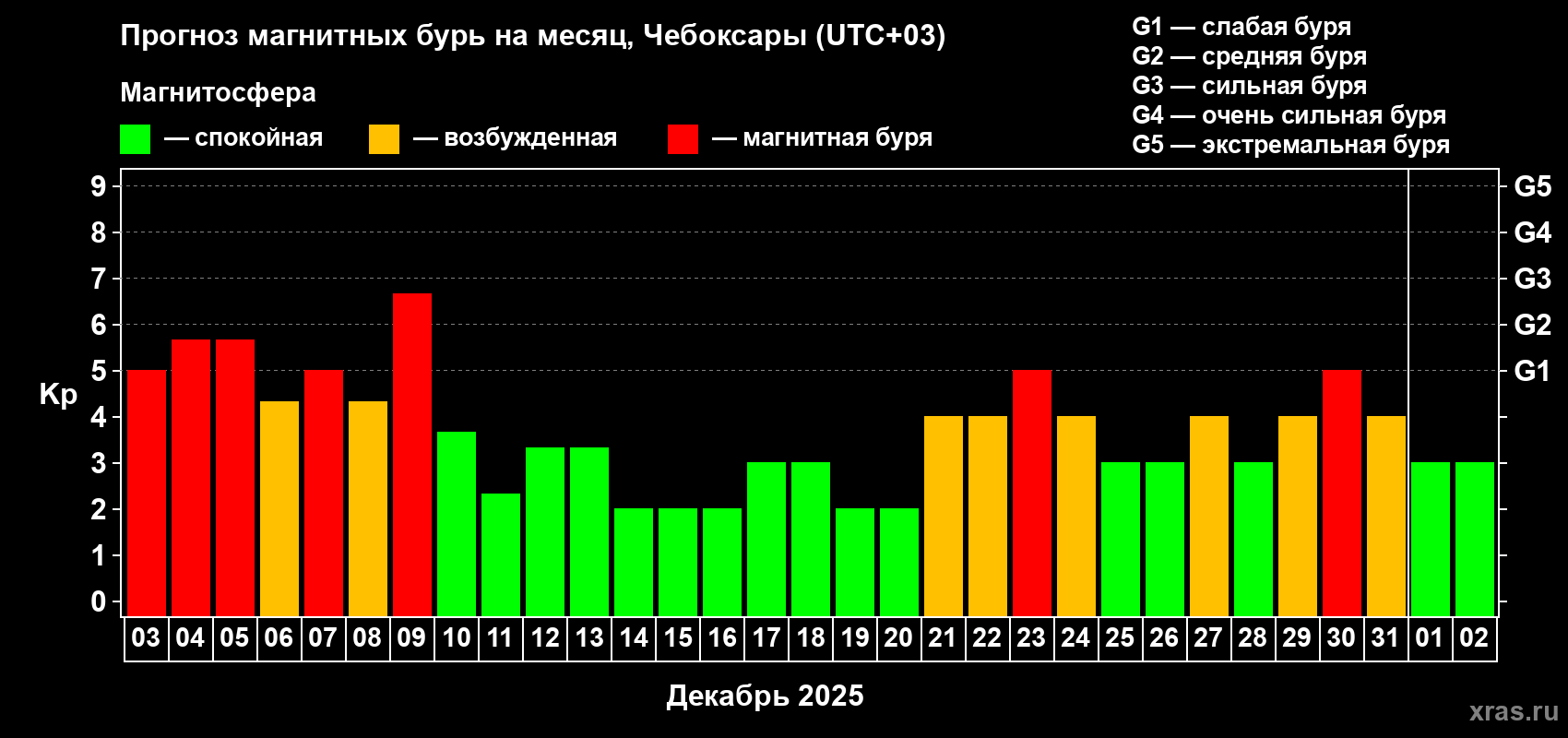 Прогноз магнитных бурь Чебоксарах — 3 декабря 2025 года
