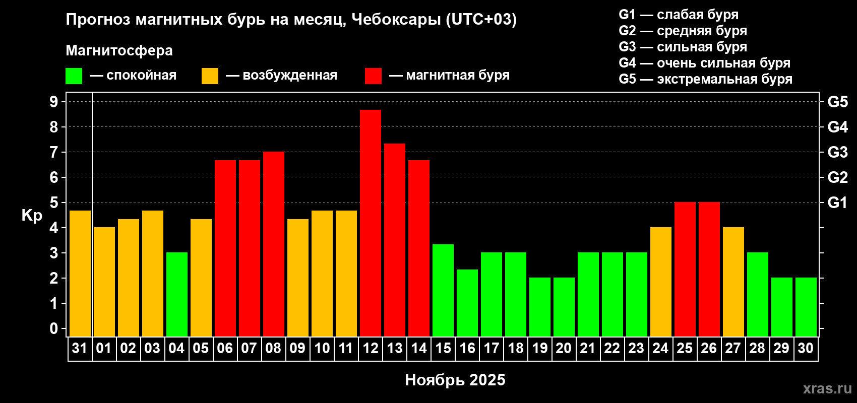 Прогноз магнитных бурь Чебоксарах — 31 октября 2025 года
