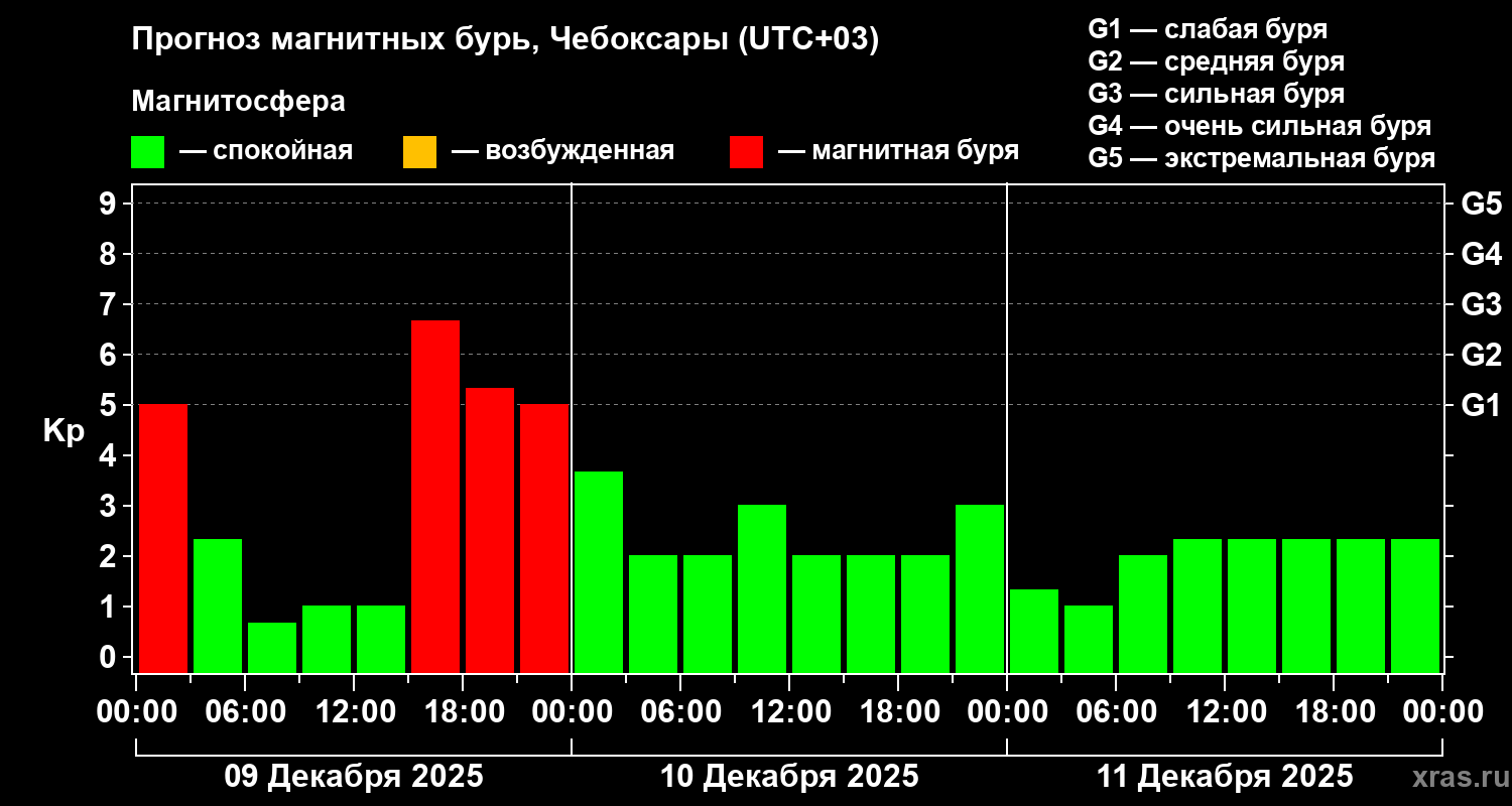 Прогноз магнитных бурь Чебоксарах на 9 декабря 2025 года