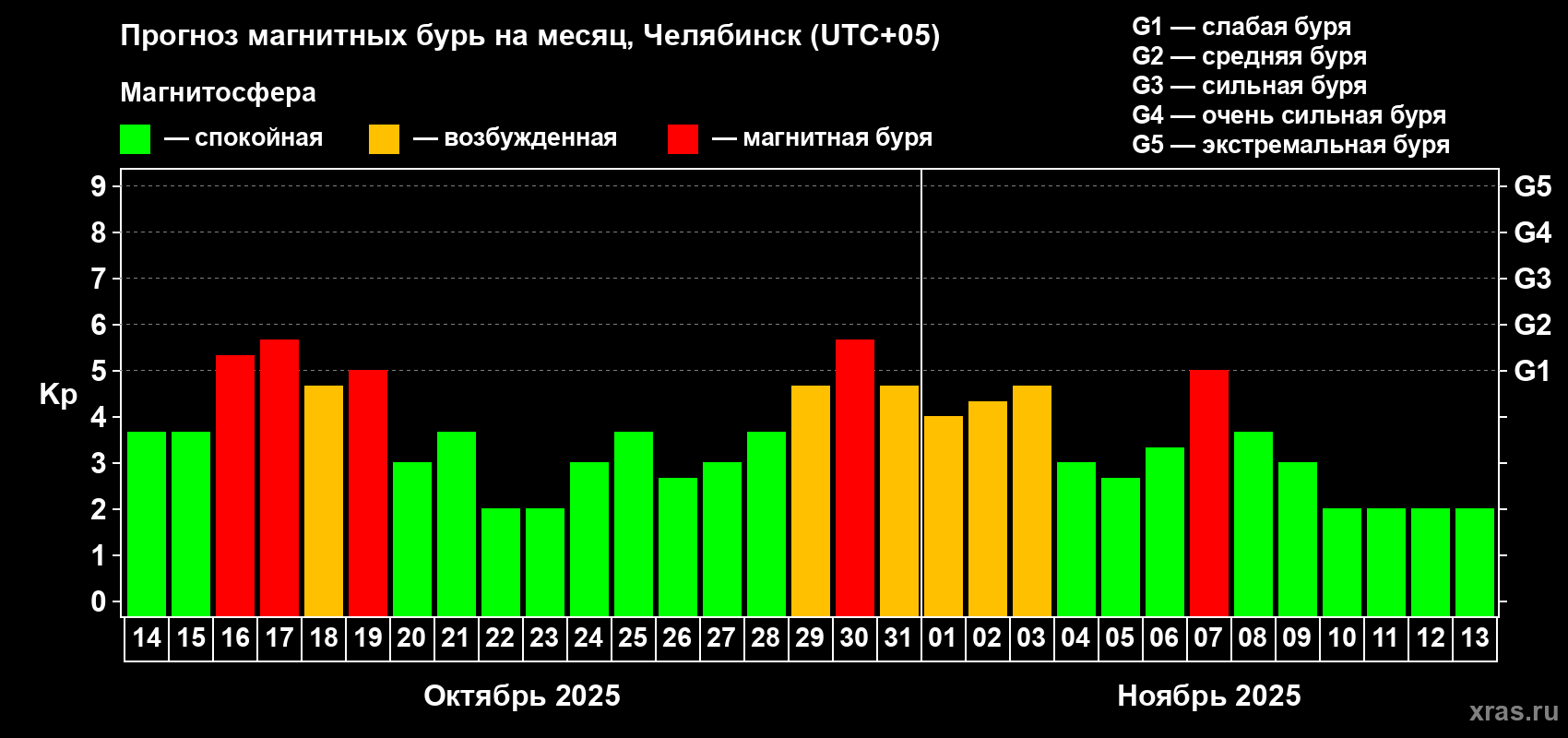 Прогноз магнитных бурь в Челябинске — 14 октября 2025 года