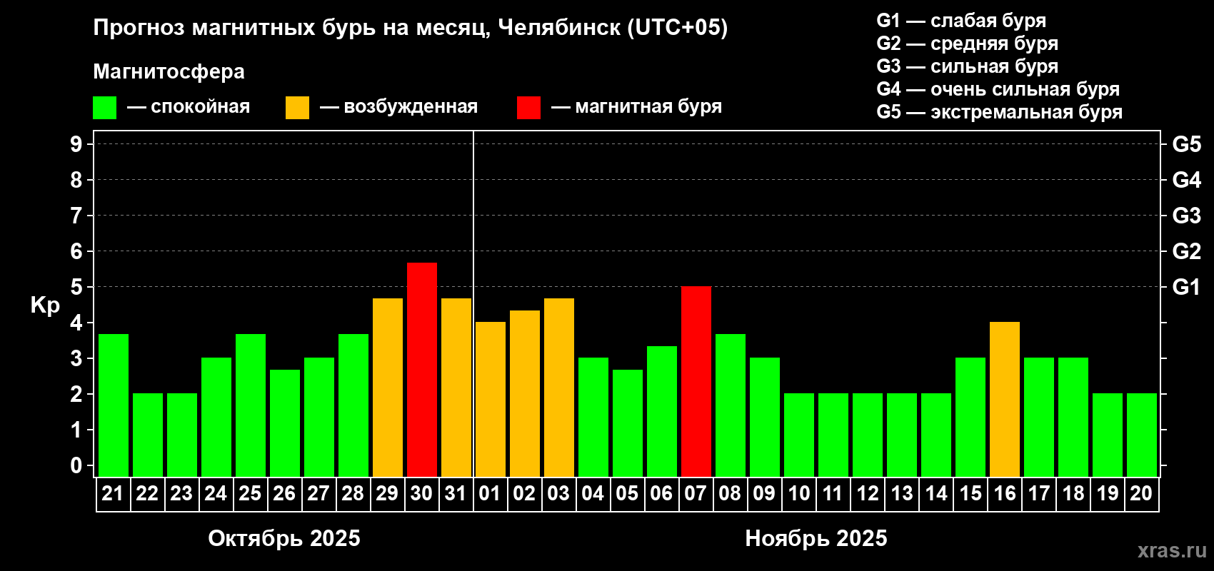 Прогноз магнитных бурь в Челябинске на 21 октября 2025 года