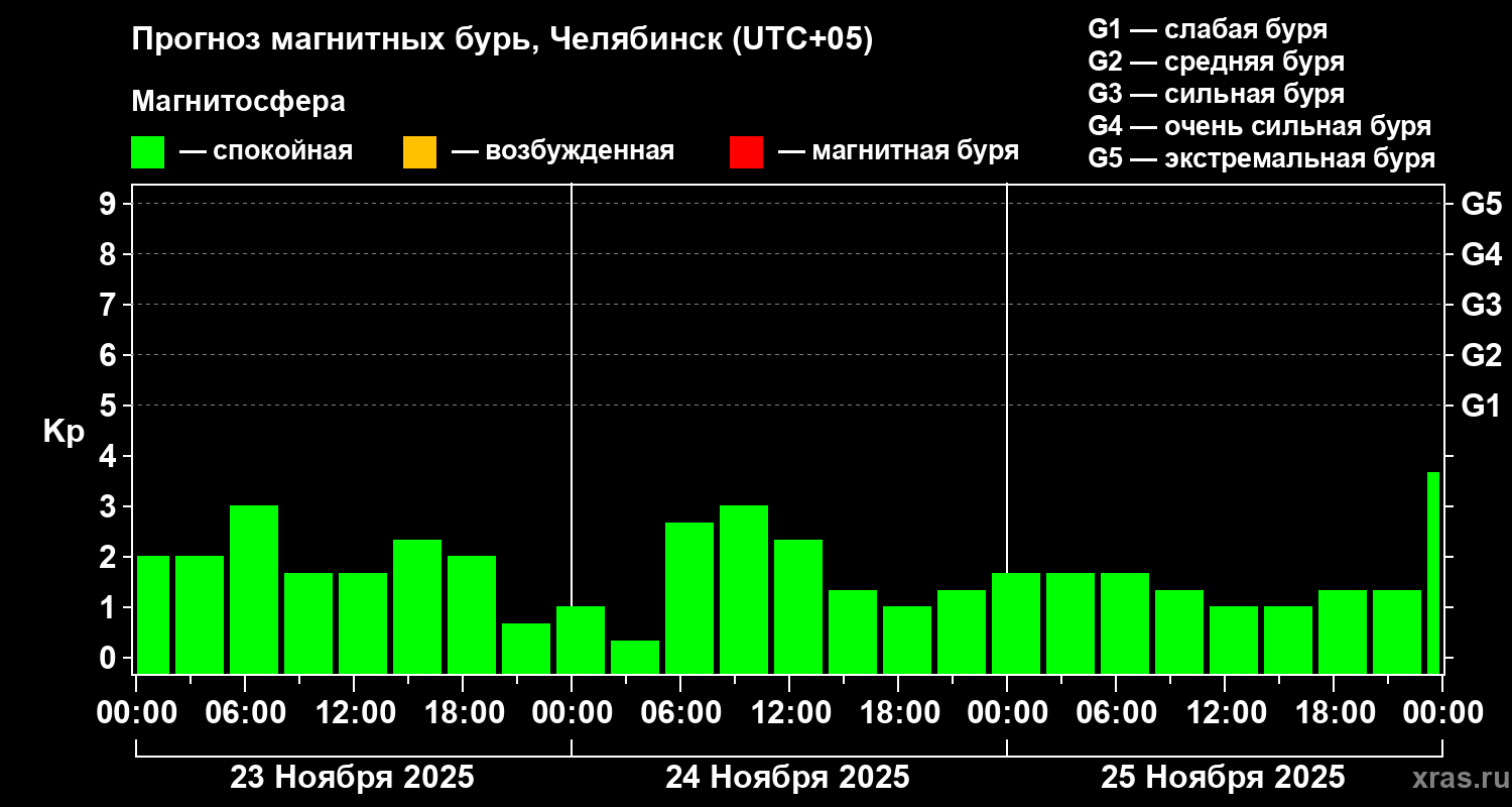 Прогноз магнитных бурь в Челябинске на 23 ноября 2025 года