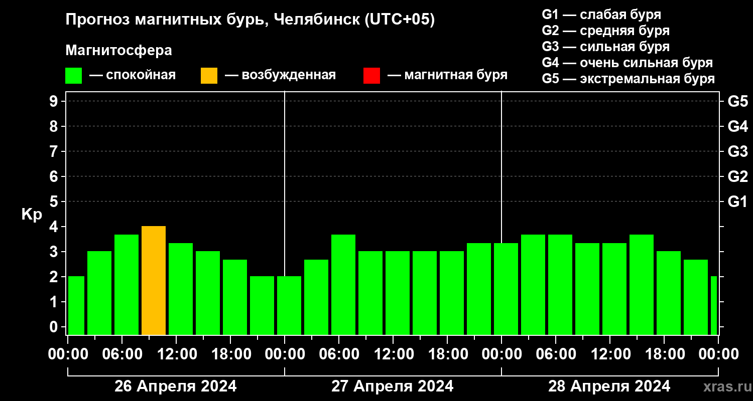 Прогноз магнитных бурь в Челябинске — 26 апреля 2024 года