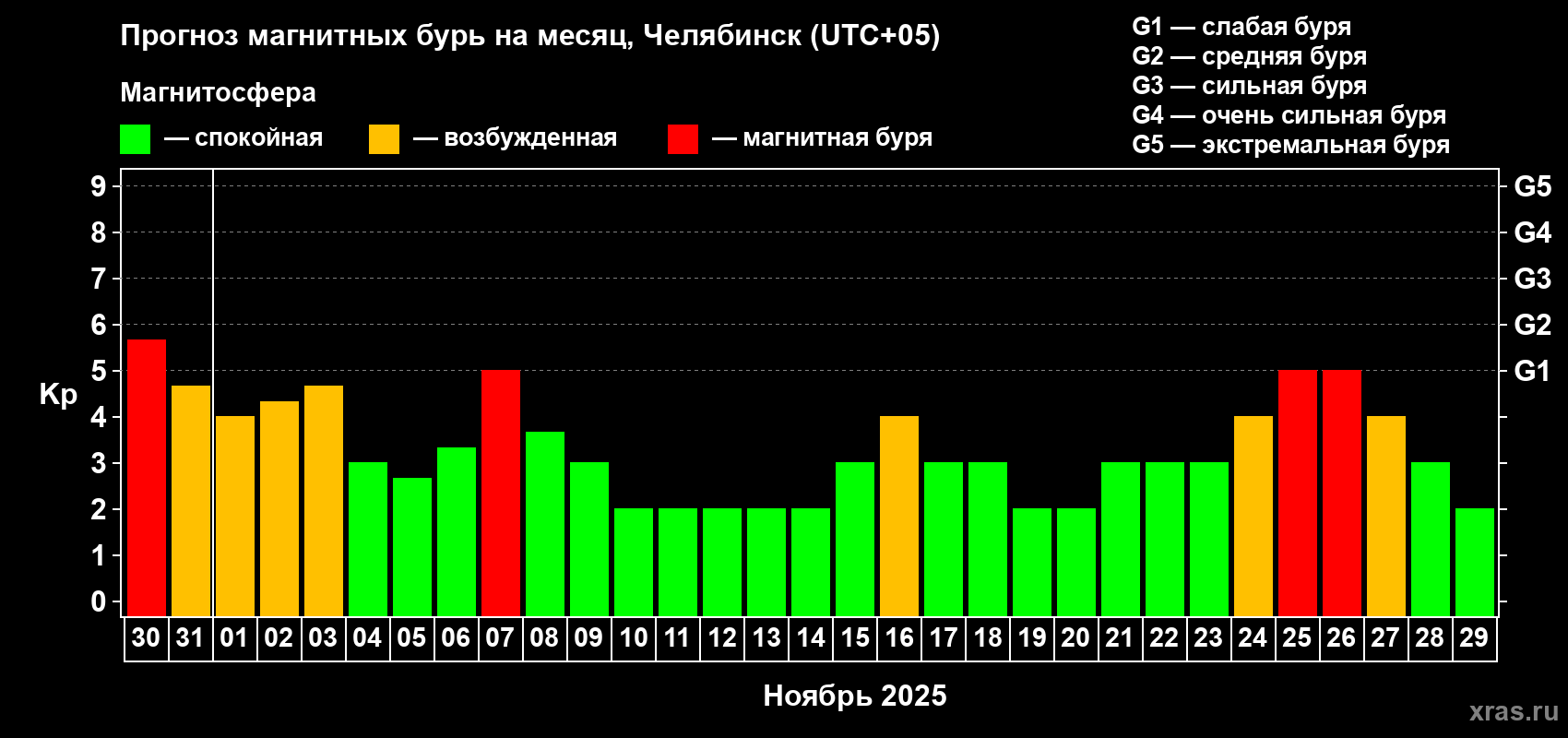 Прогноз магнитных бурь в Челябинске на 30 октября 2025 года