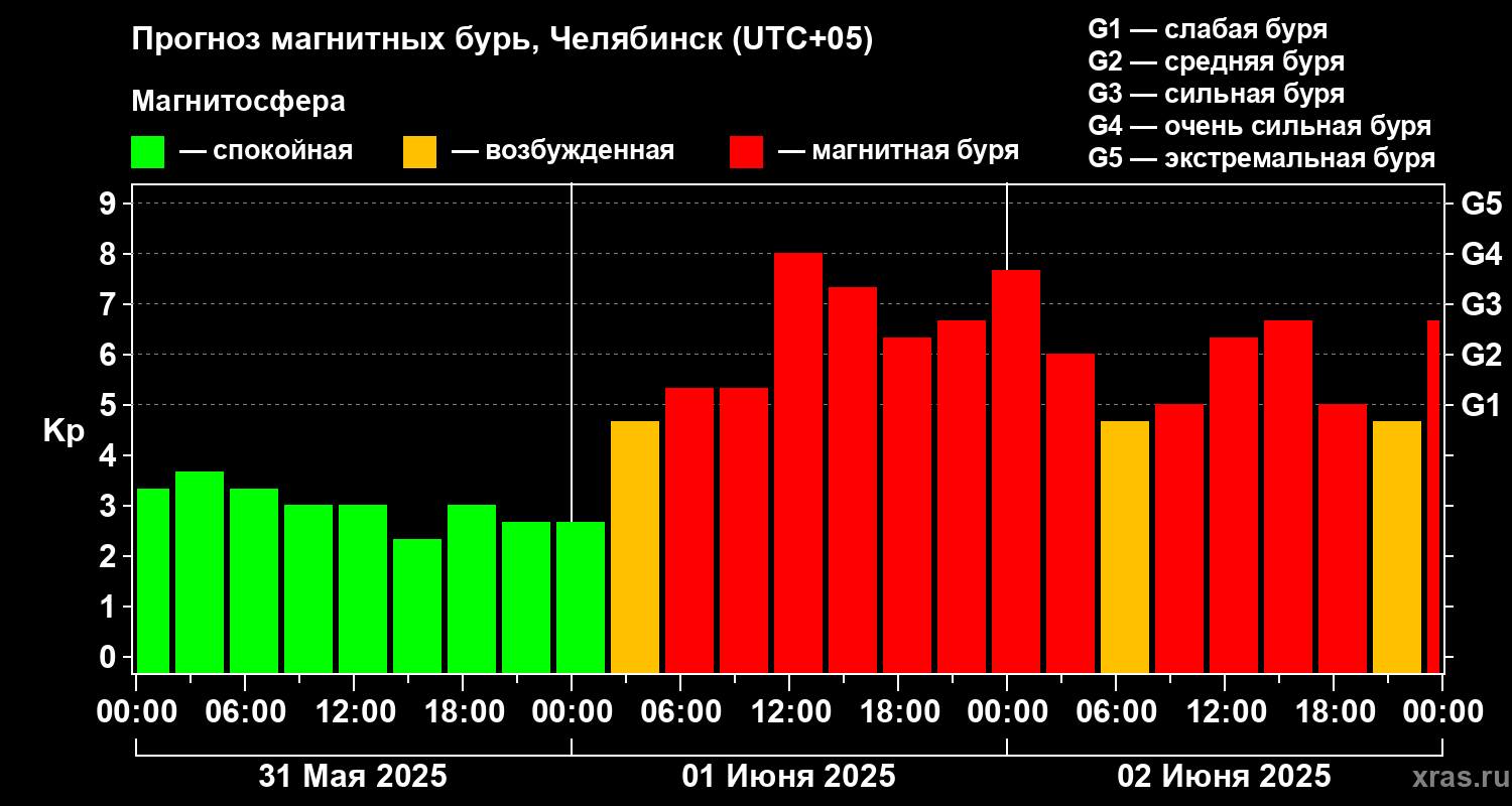Прогноз магнитных бурь в Челябинске на 31 мая 2025 года