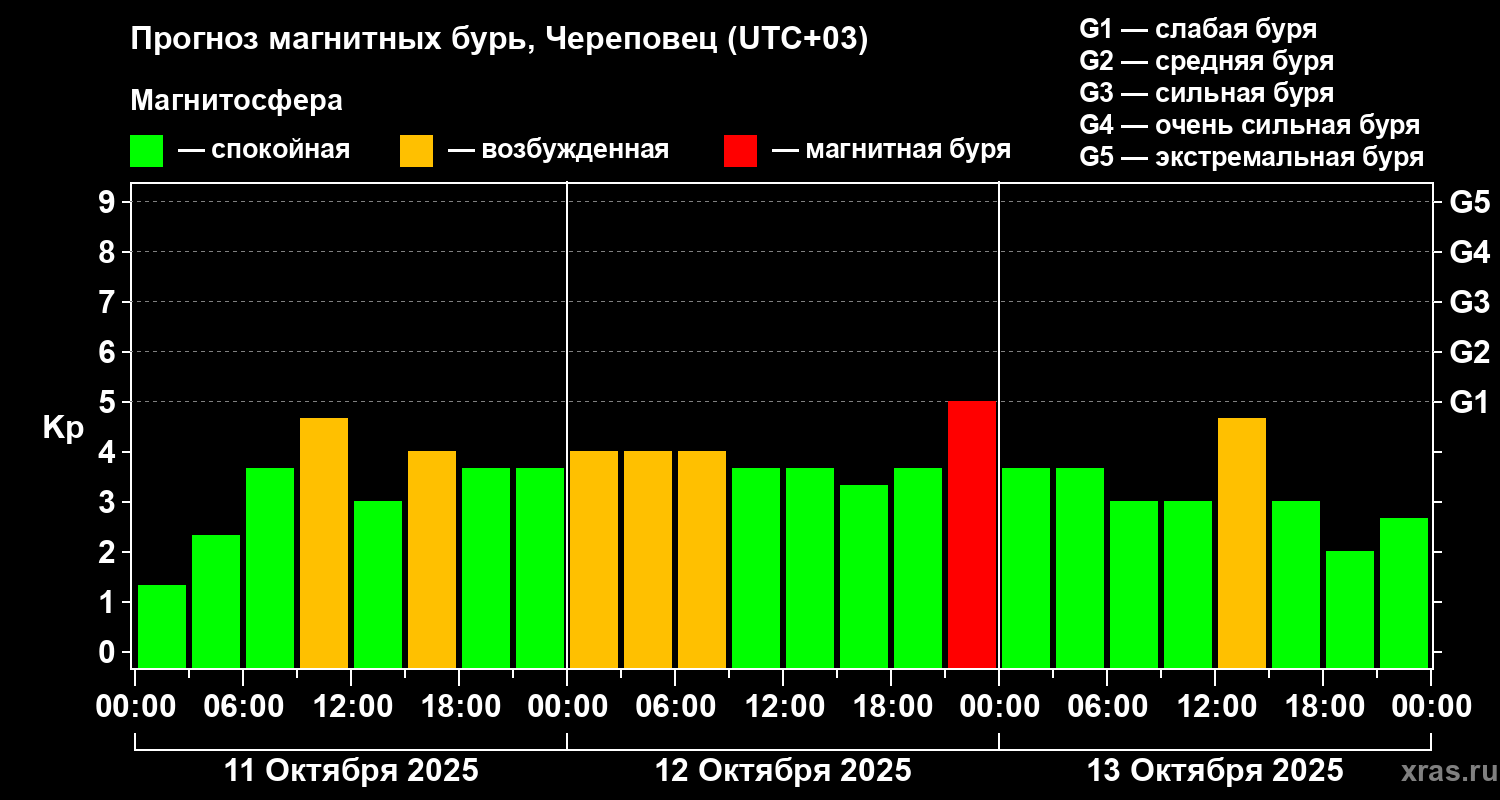 Прогноз магнитных бурь Череповце на 11 октября 2025 года