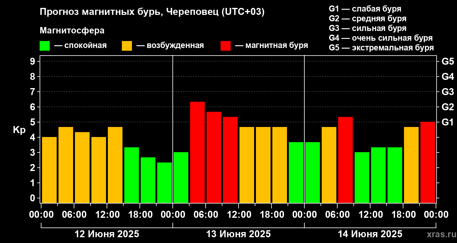 Прогноз магнитных бурь Череповце — 12 июня 2025 года