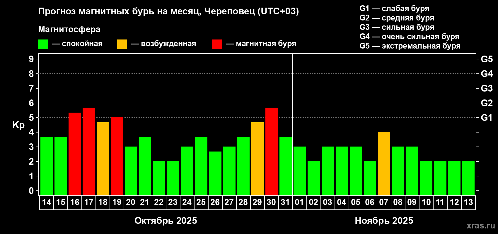 Прогноз магнитных бурь Череповце — 14 октября 2025 года