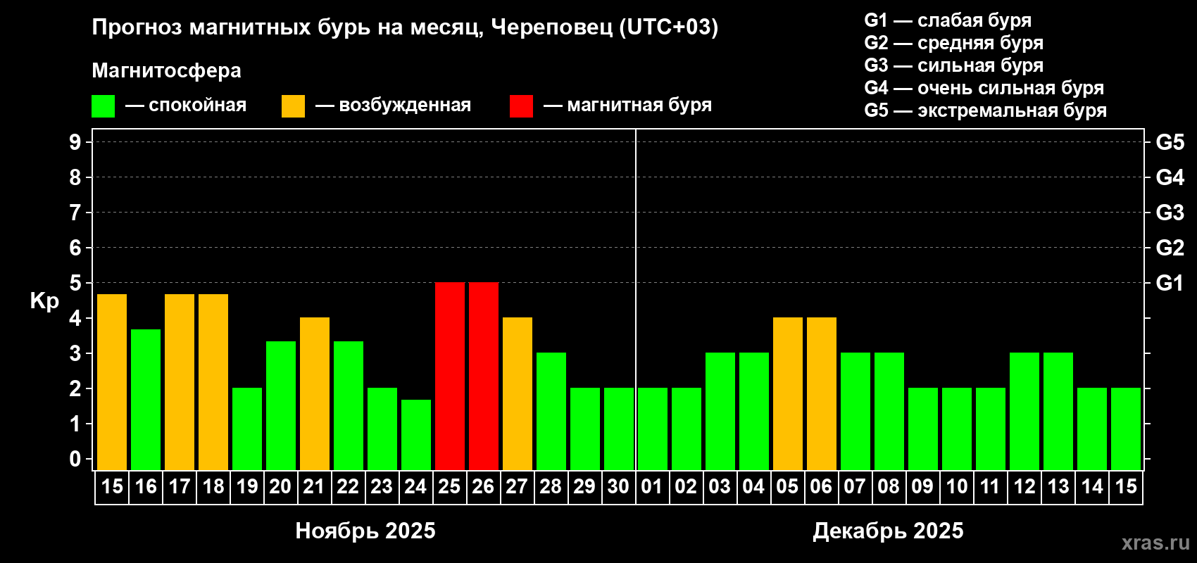 Прогноз магнитных бурь Череповце — 15 ноября 2025 года