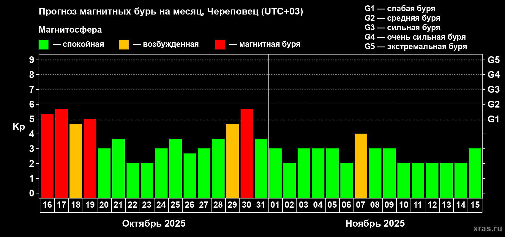 Прогноз магнитных бурь Череповце на 16 октября 2025 года