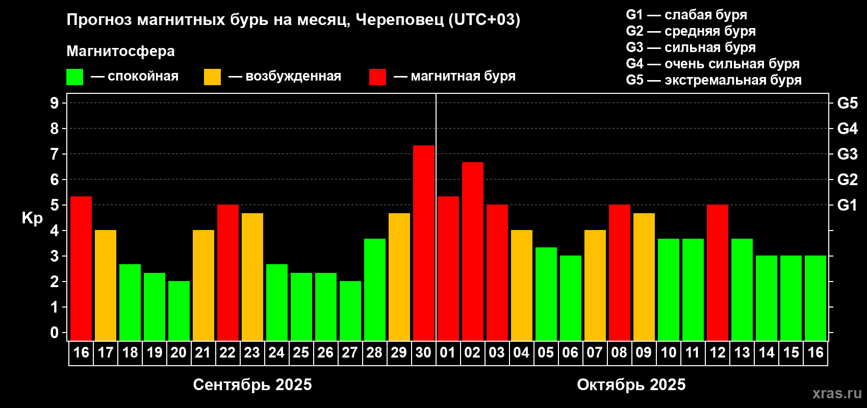 Прогноз магнитных бурь Череповце — 16 сентября 2025 года