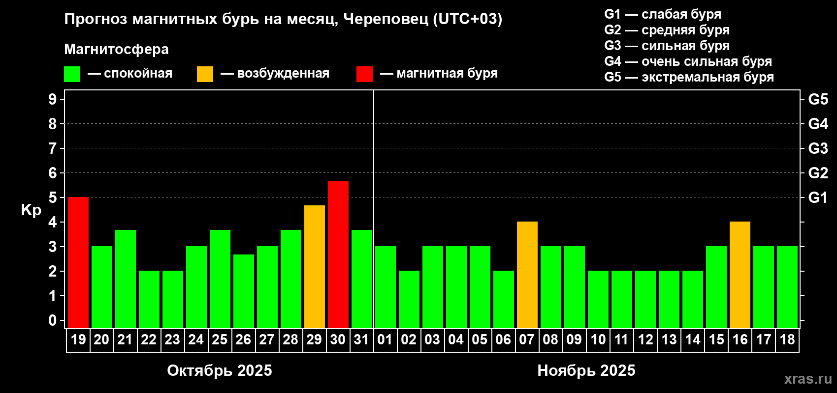 Прогноз магнитных бурь Череповце на 19 октября 2025 года