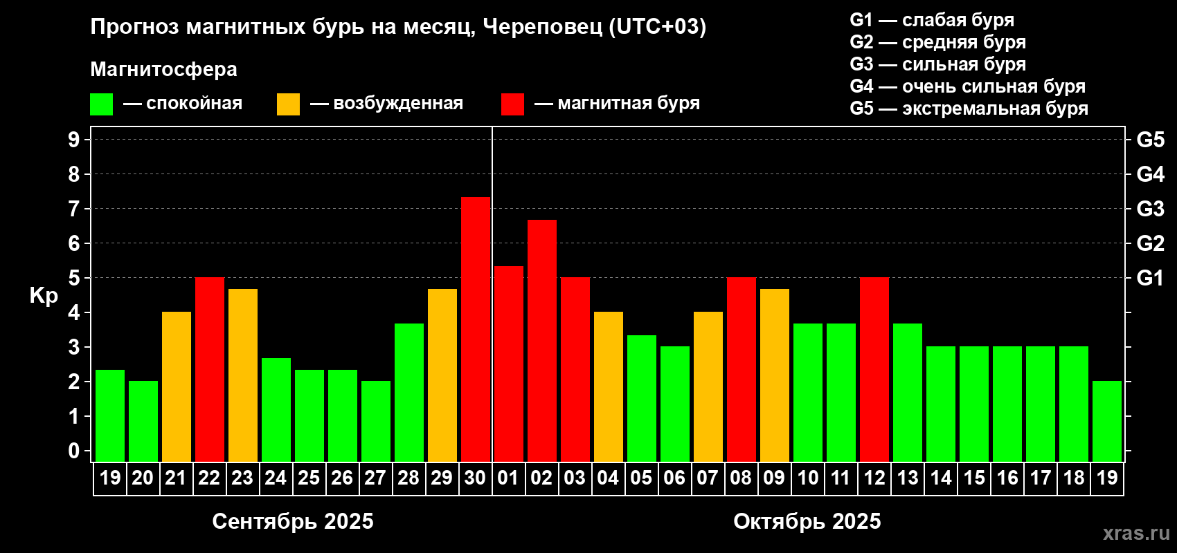Прогноз магнитных бурь Череповце — 19 сентября 2025 года