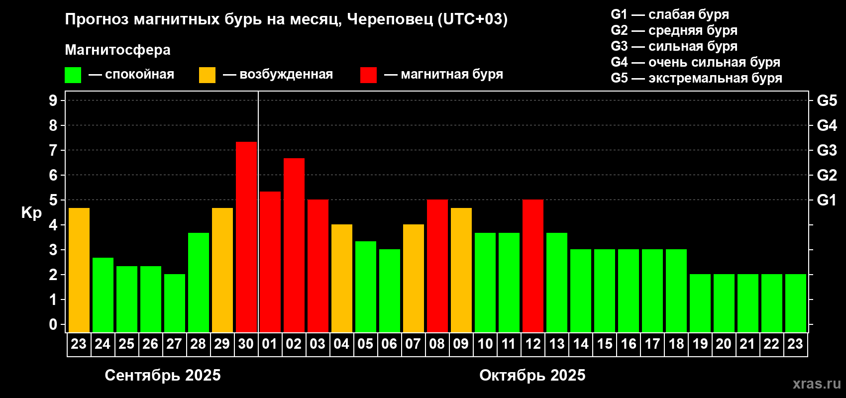 Прогноз магнитных бурь Череповце на 23 сентября 2025 года