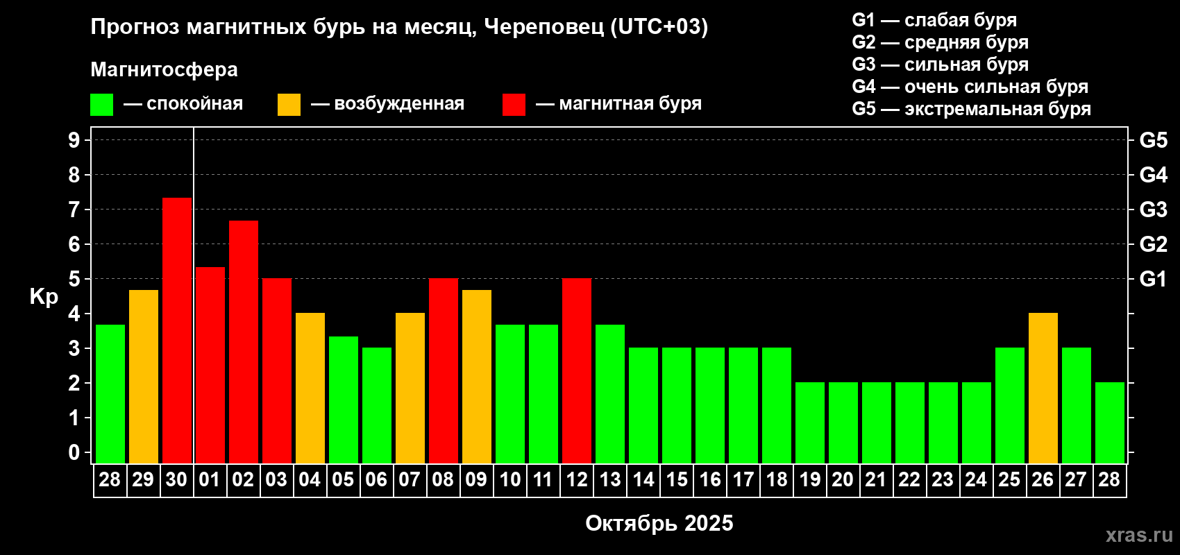 Прогноз магнитных бурь Череповце на 28 сентября 2025 года