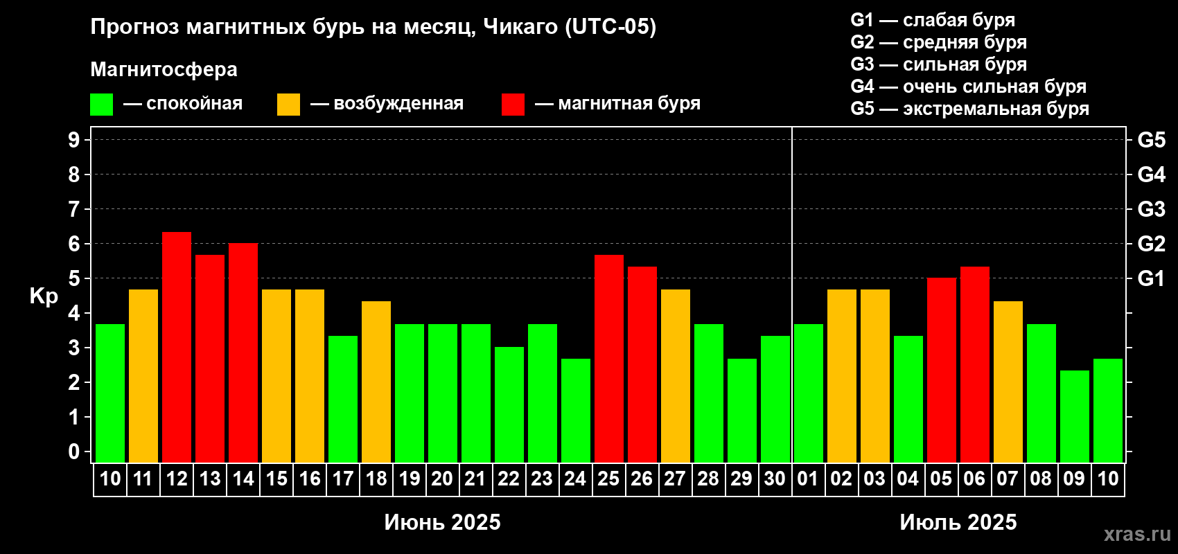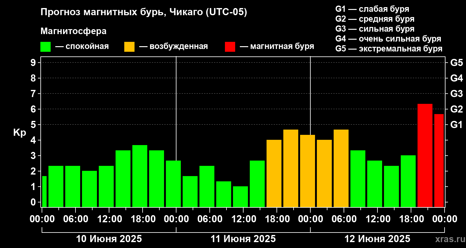 Прогноз магнитных бурь Чикаго — 10 июня 2025 года