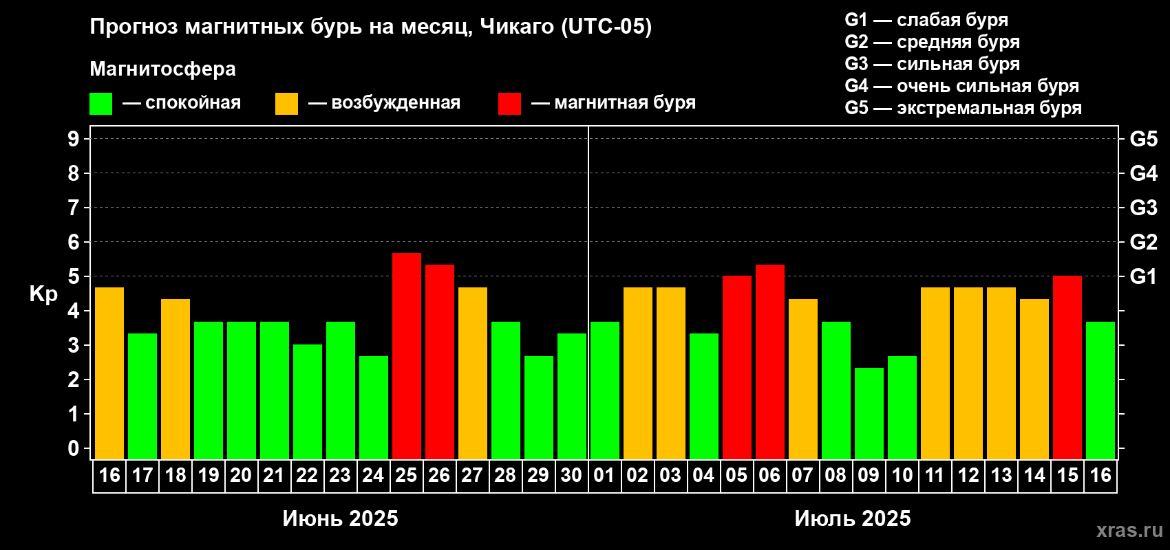 Прогноз магнитных бурь Чикаго на 16 июня 2025 года