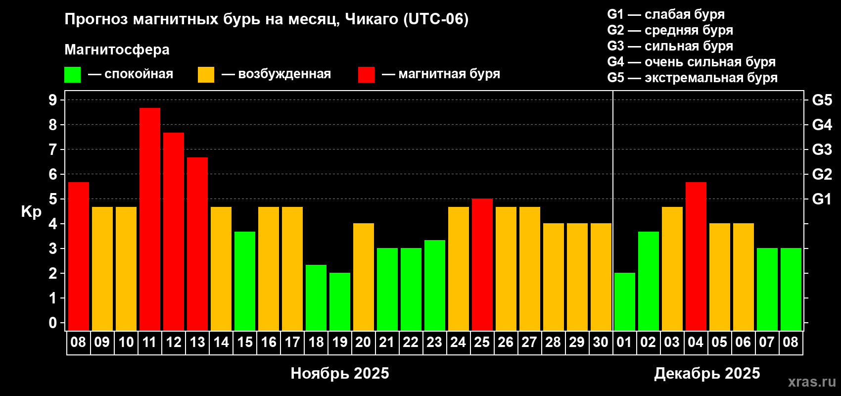 Прогноз магнитных бурь Чикаго — 8 ноября 2025 года