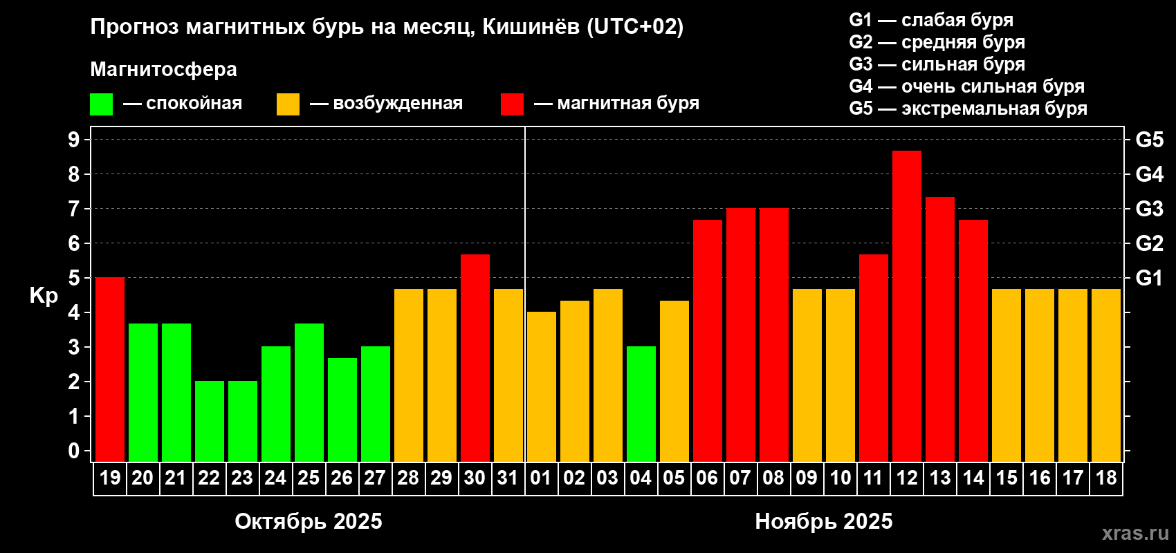 Прогноз магнитных бурь в Кишинёве — 19 октября 2025 года