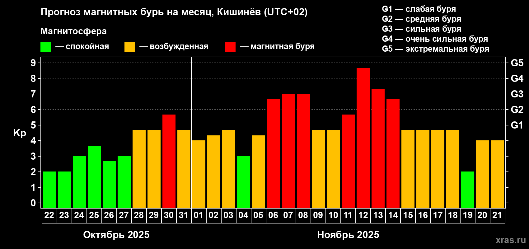 Прогноз магнитных бурь в Кишинёве — 22 октября 2025 года