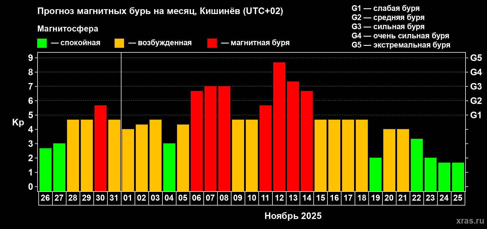 Прогноз магнитных бурь в Кишинёве — 26 октября 2025 года