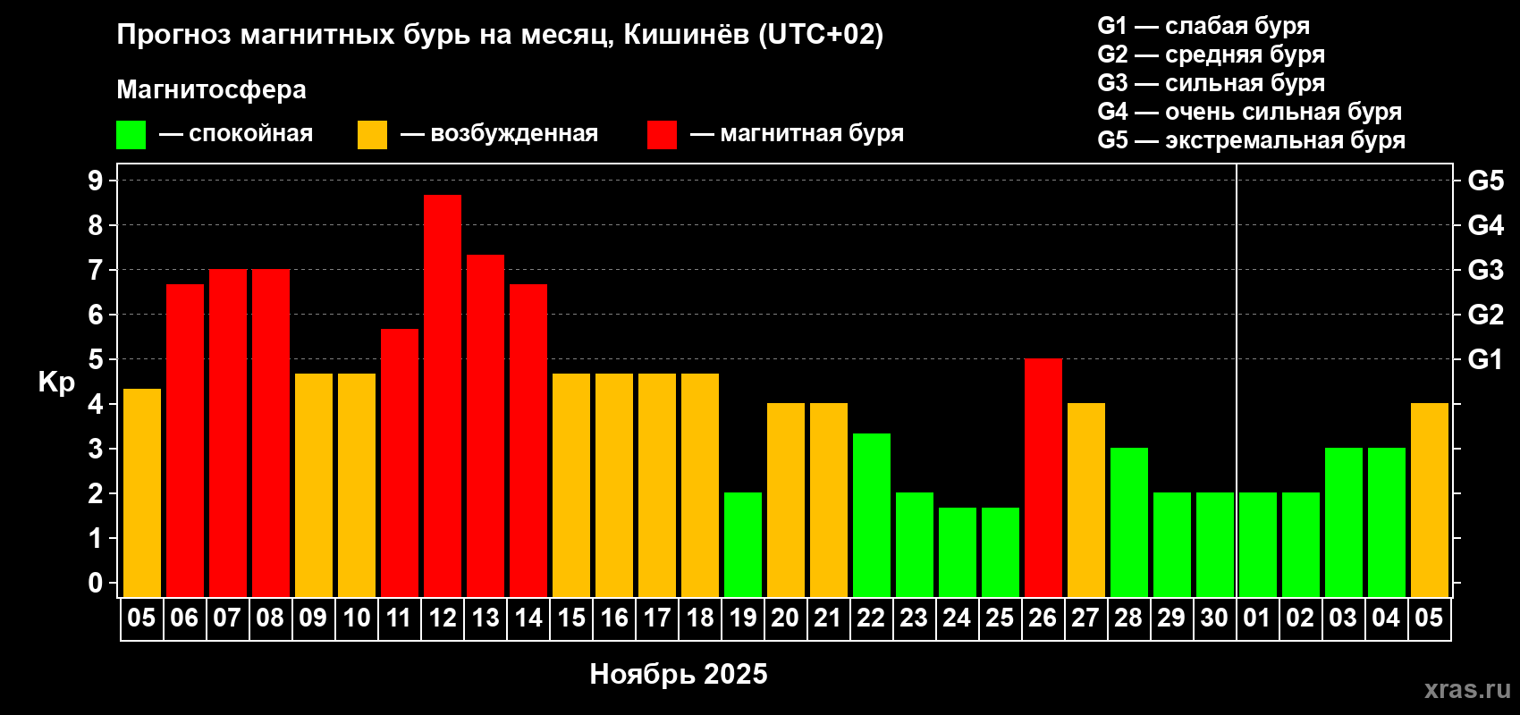 Прогноз магнитных бурь в Кишинёве — 5 ноября 2025 года
