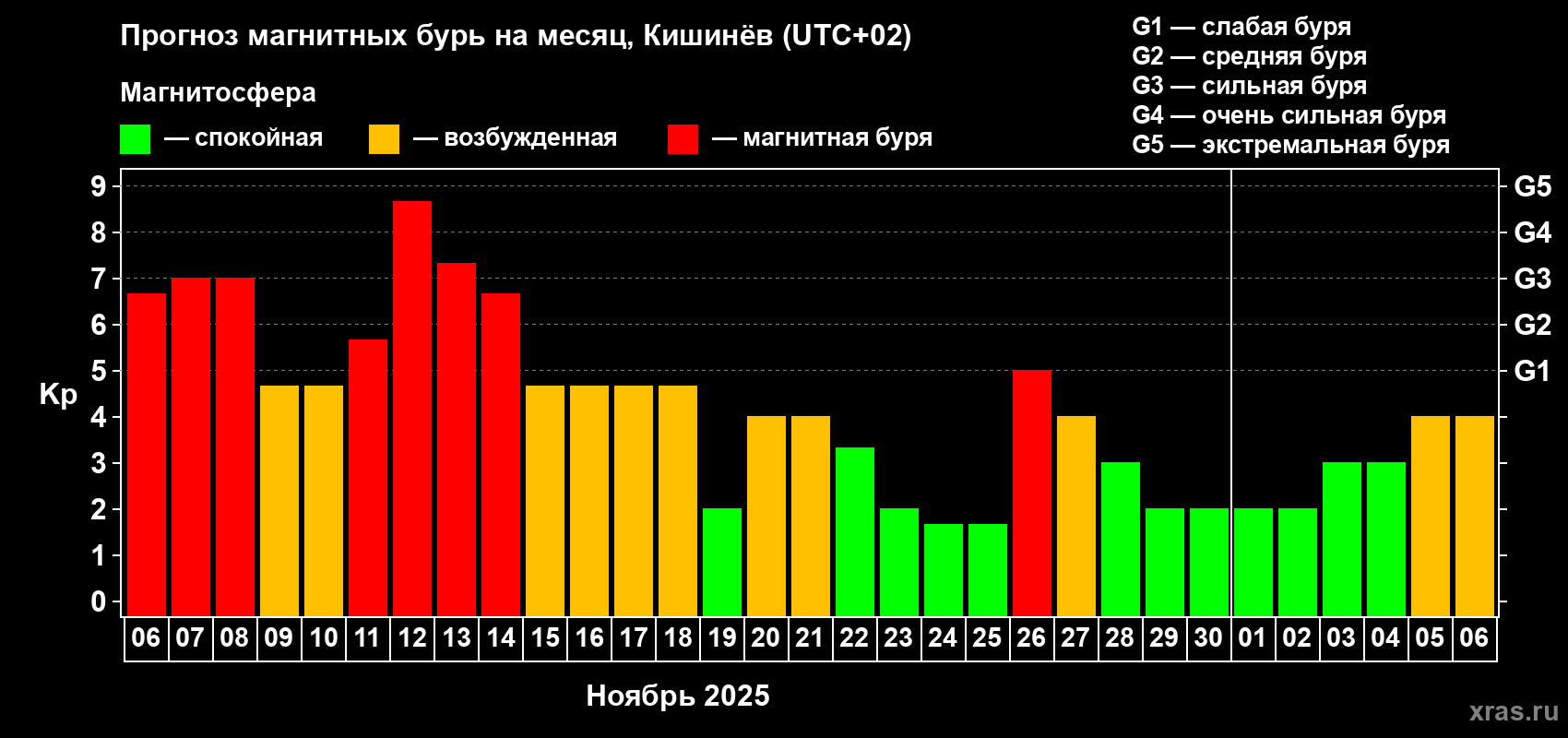 Прогноз магнитных бурь в Кишинёве — 6 ноября 2025 года