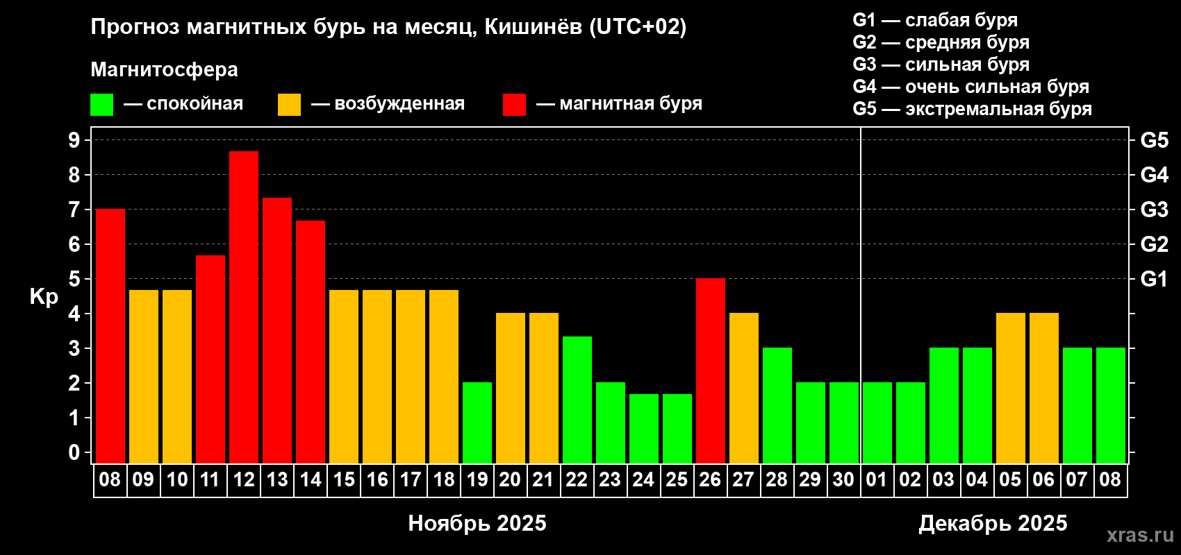 Прогноз магнитных бурь в Кишинёве — 8 ноября 2025 года