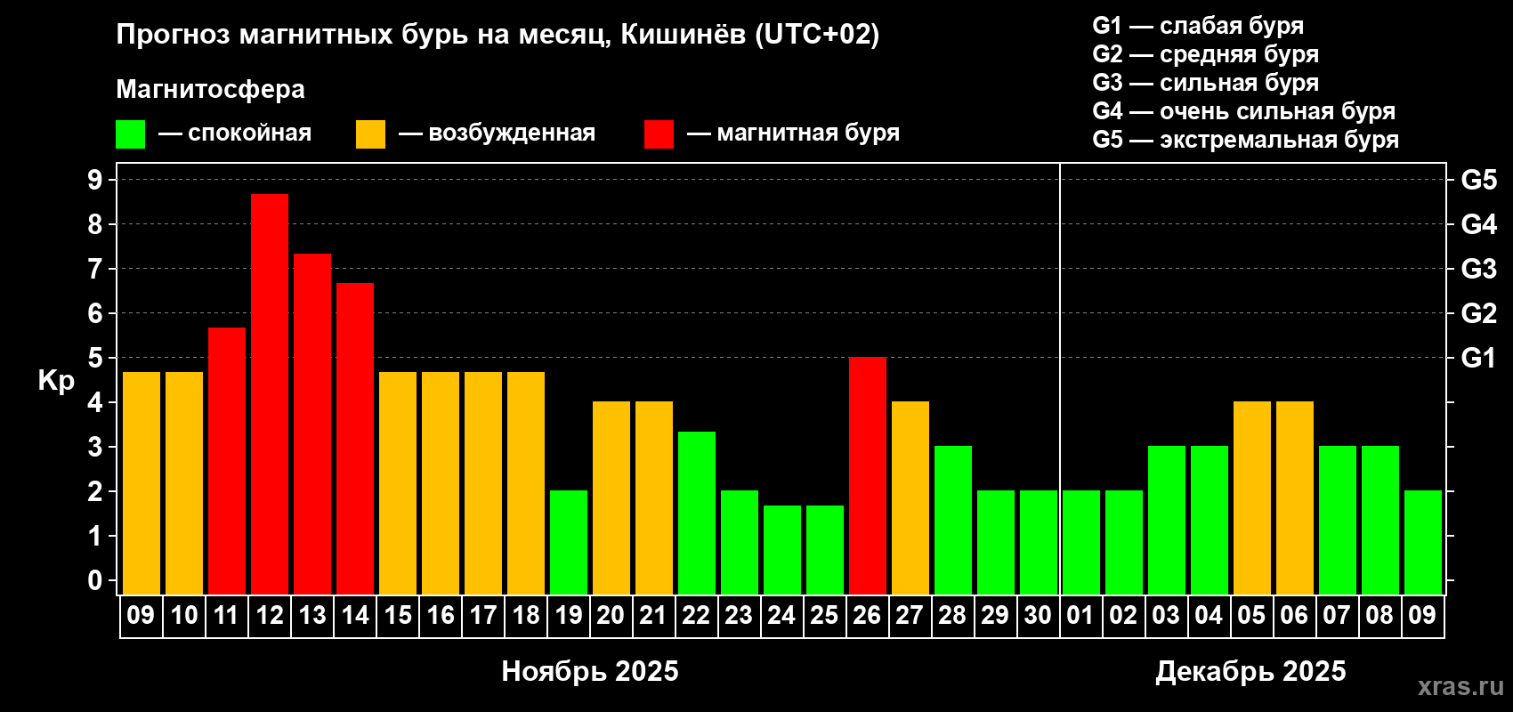 Прогноз магнитных бурь в Кишинёве — 9 ноября 2025 года