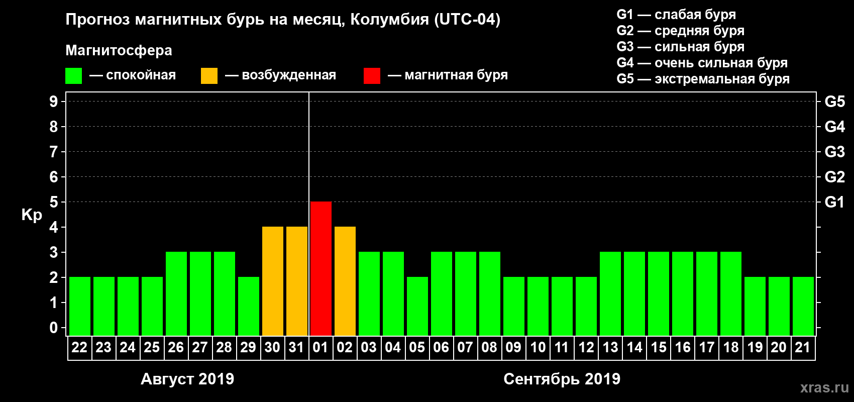 Прогноз магнитных бурь в Колумбии — 22 августа 2019 года