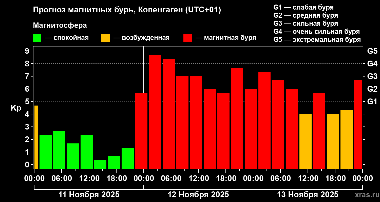 Прогноз магнитных бурь в Копенгагене — 11 ноября 2025 года