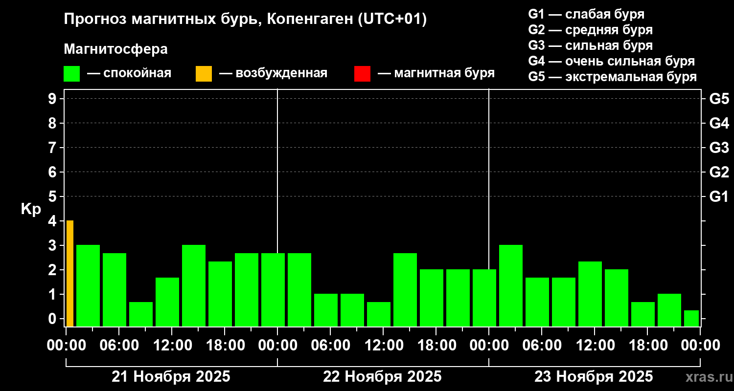 Прогноз магнитных бурь в Копенгагене — 21 ноября 2025 года