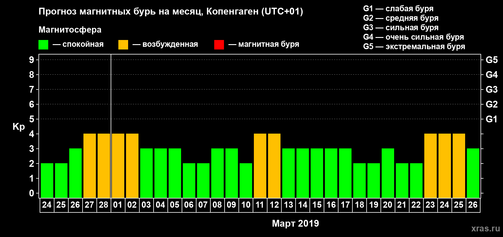 Прогноз максимального суточного геомагнитного индекса Kp на 1 месяц (31 день) с 24 февраля по 26 марта 2019 г