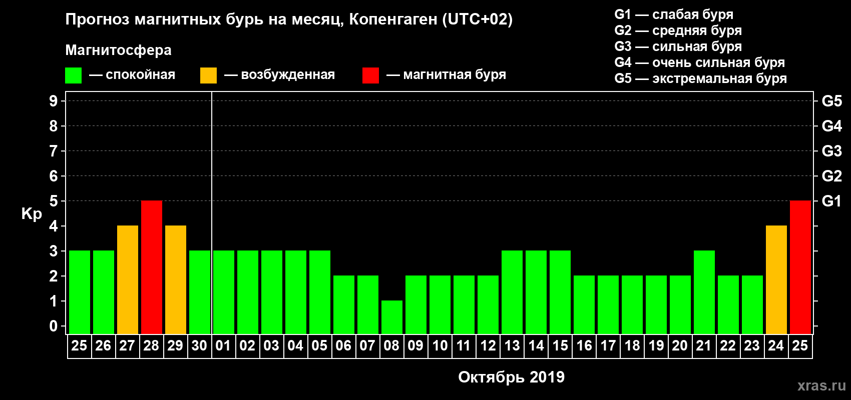 Прогноз максимального суточного геомагнитного индекса Kp на 1 месяц (31 день) с 25 сентября по 25 октября 2019 г