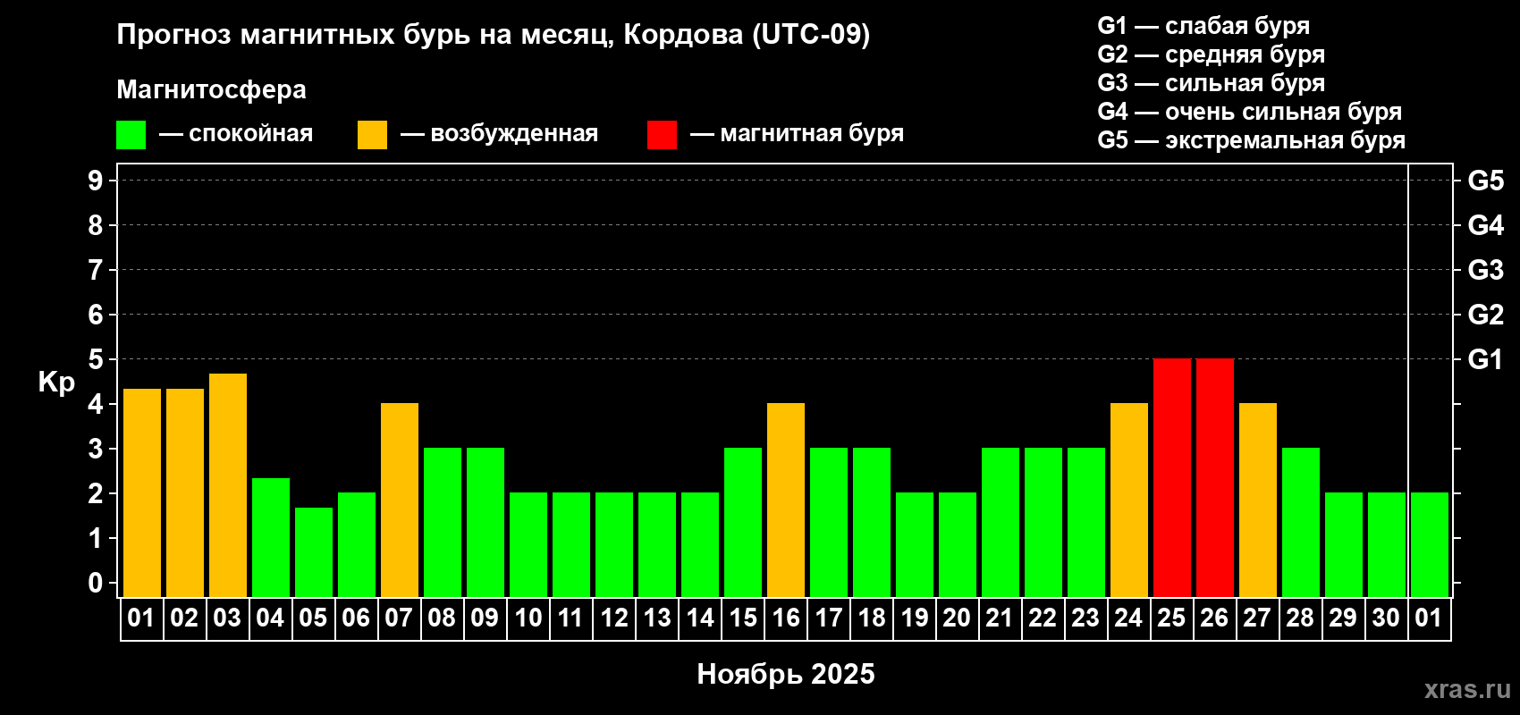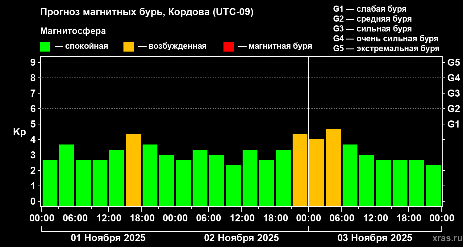 Прогноз магнитных бурь в Кордове — 1 ноября 2025 года