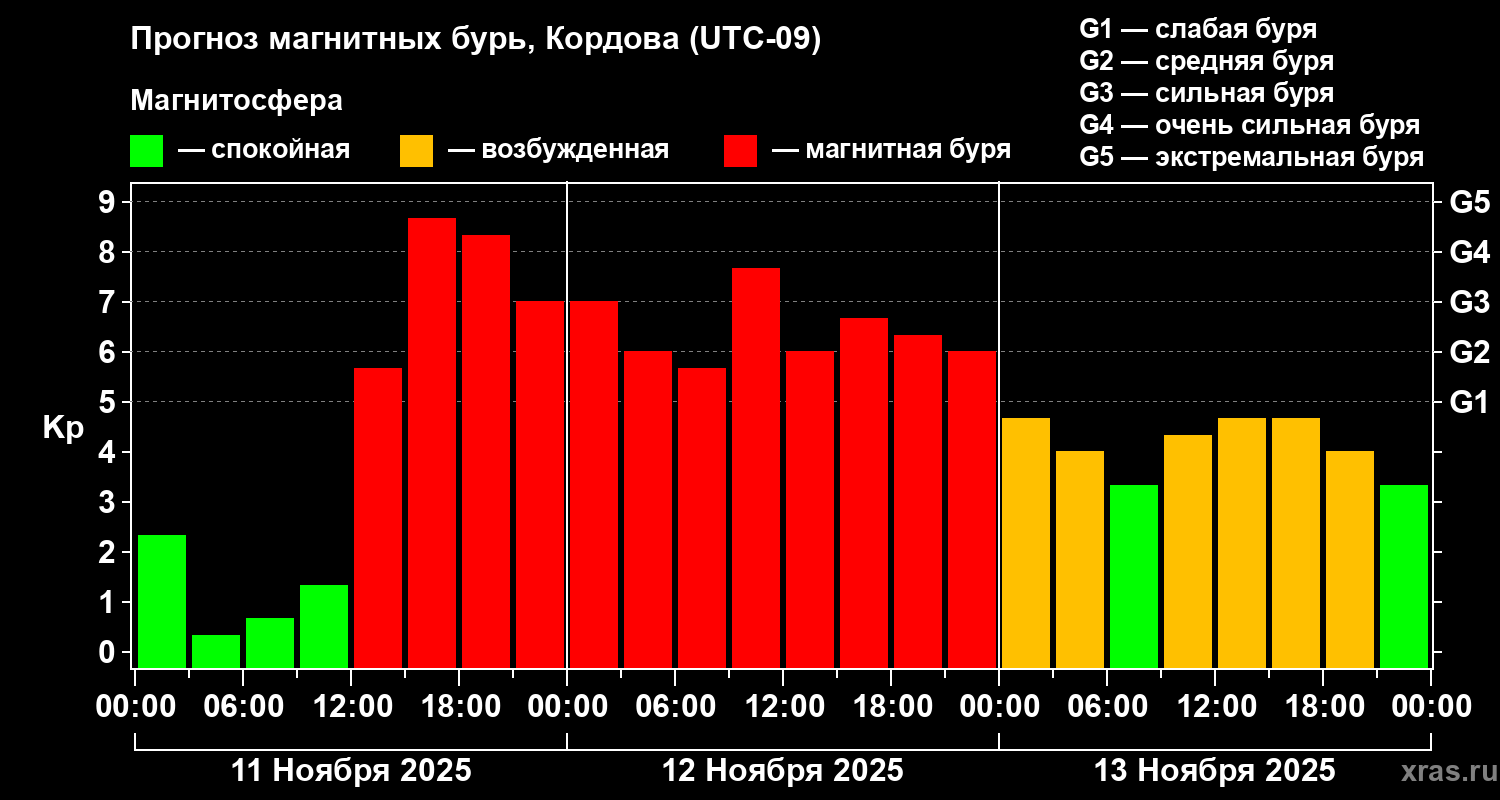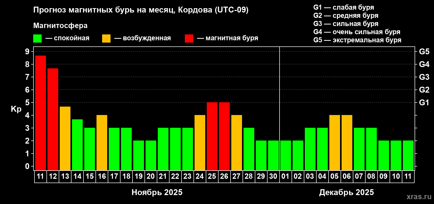 Прогноз магнитных бурь в Кордове — 11 ноября 2025 года