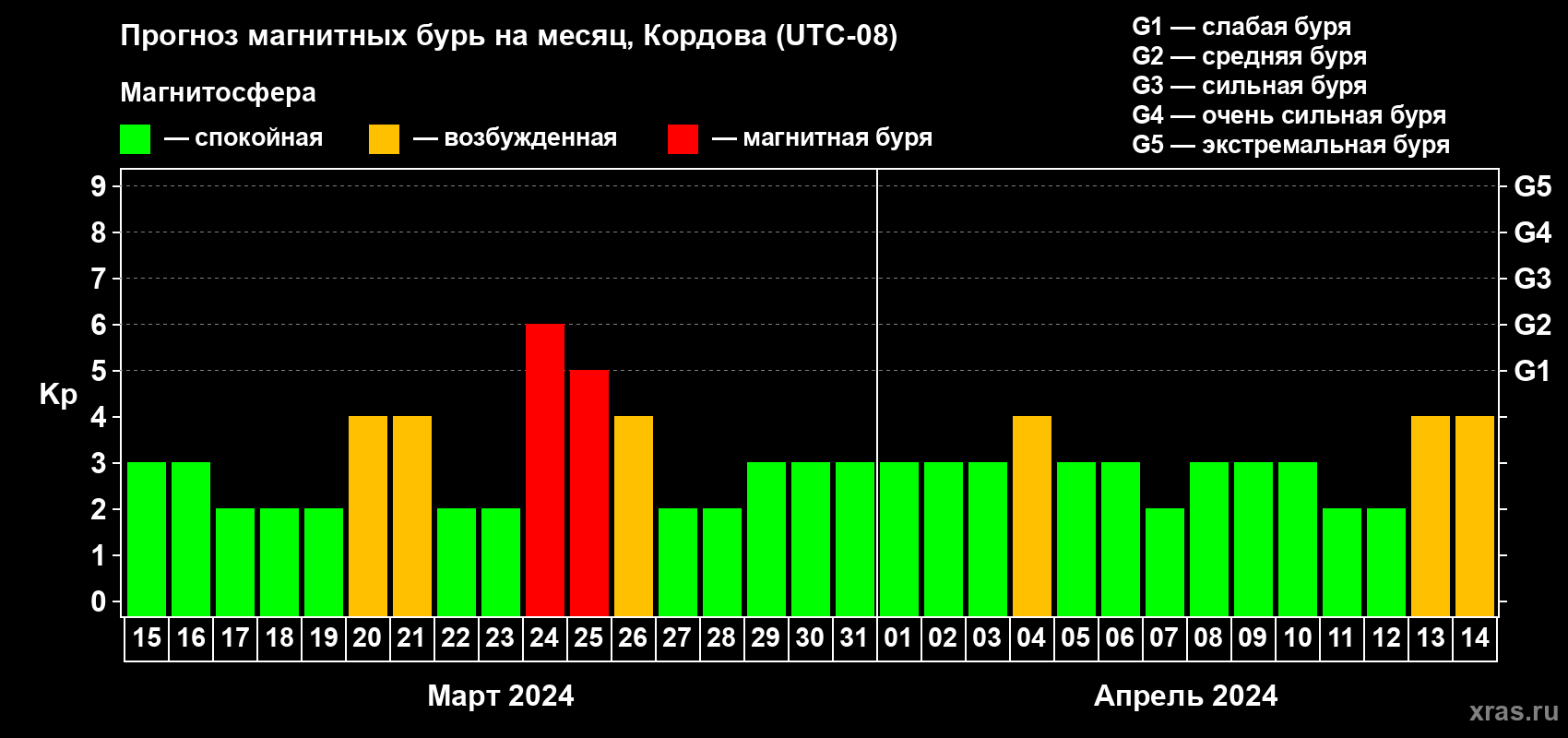 Прогноз магнитных бурь в Кордове — 15 марта 2024 года