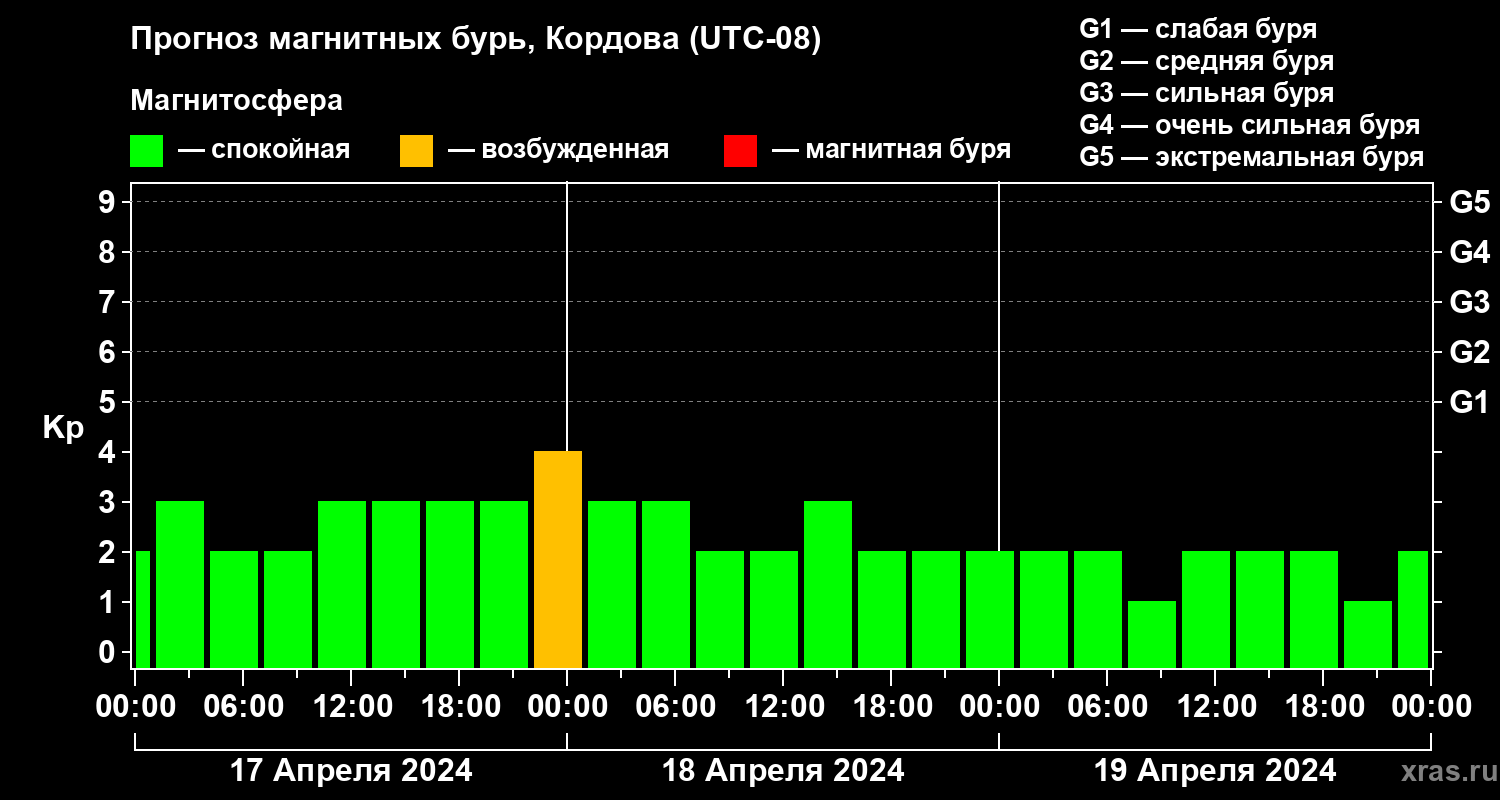 Прогноз магнитных бурь в Кордове на 17 апреля 2024 года