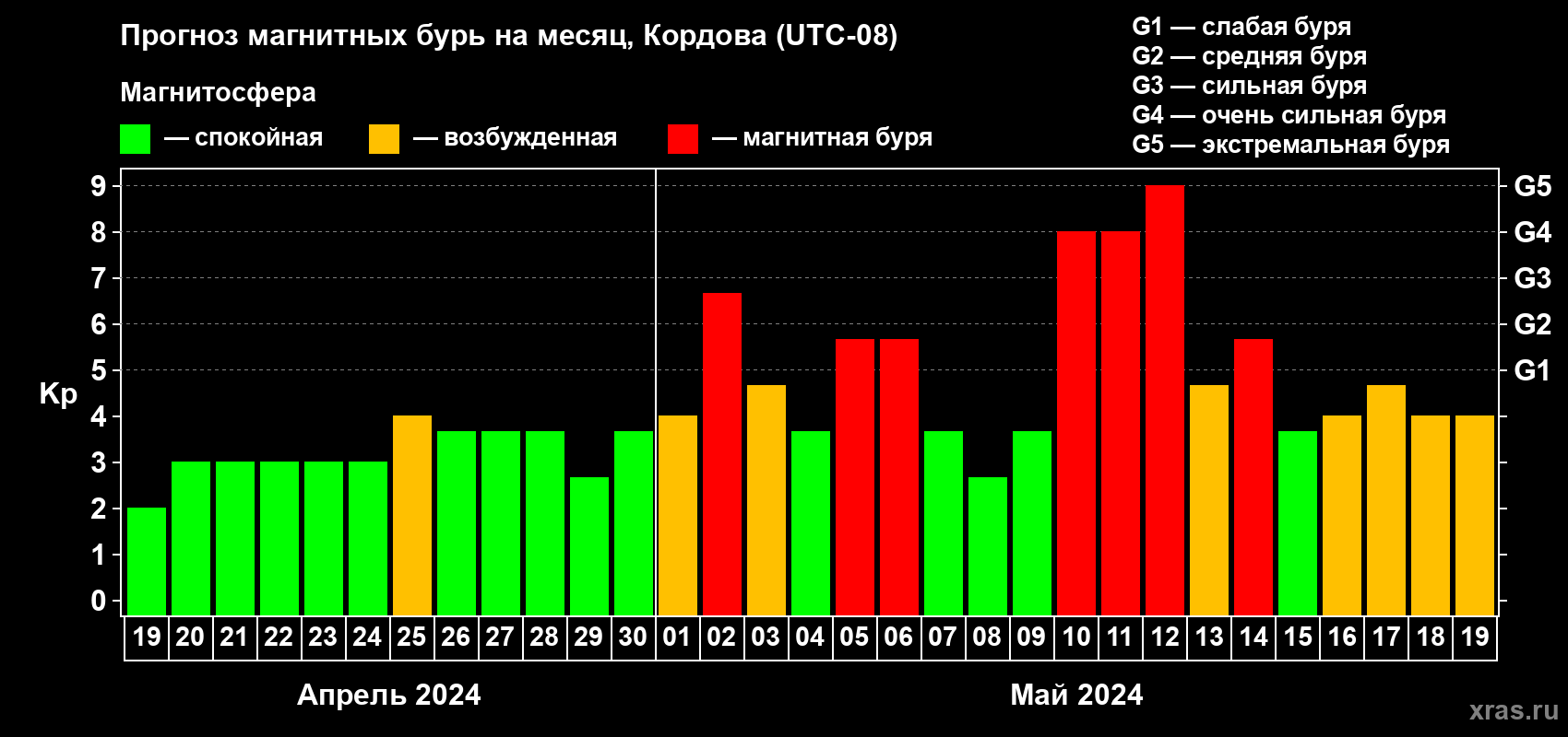 Прогноз магнитных бурь в Кордове — 19 апреля 2024 года