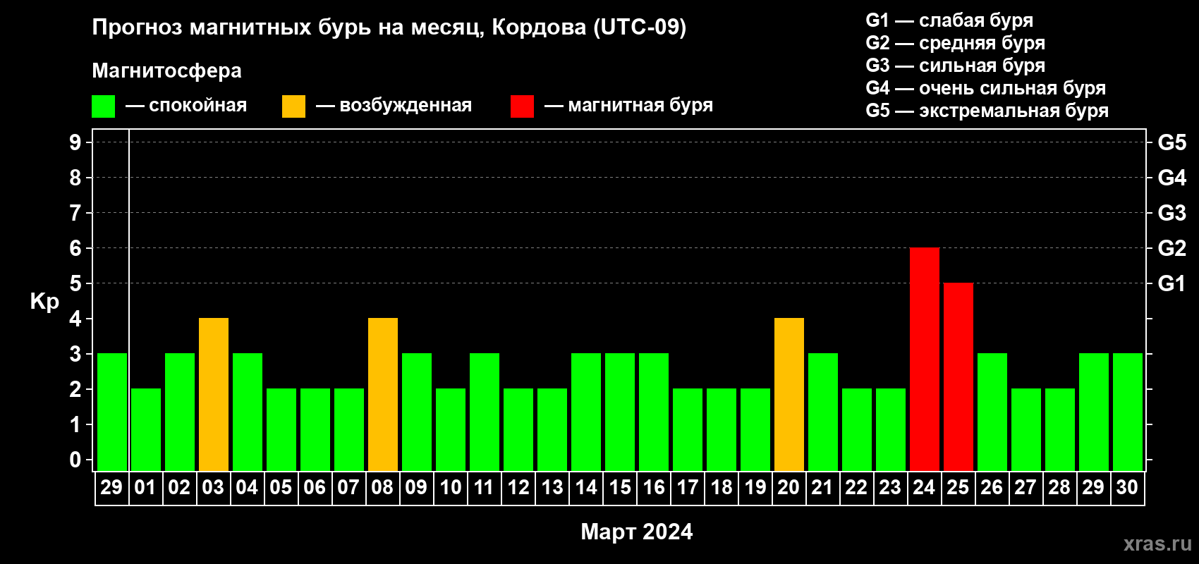 Прогноз магнитных бурь в Кордове на 29 февраля 2024 года