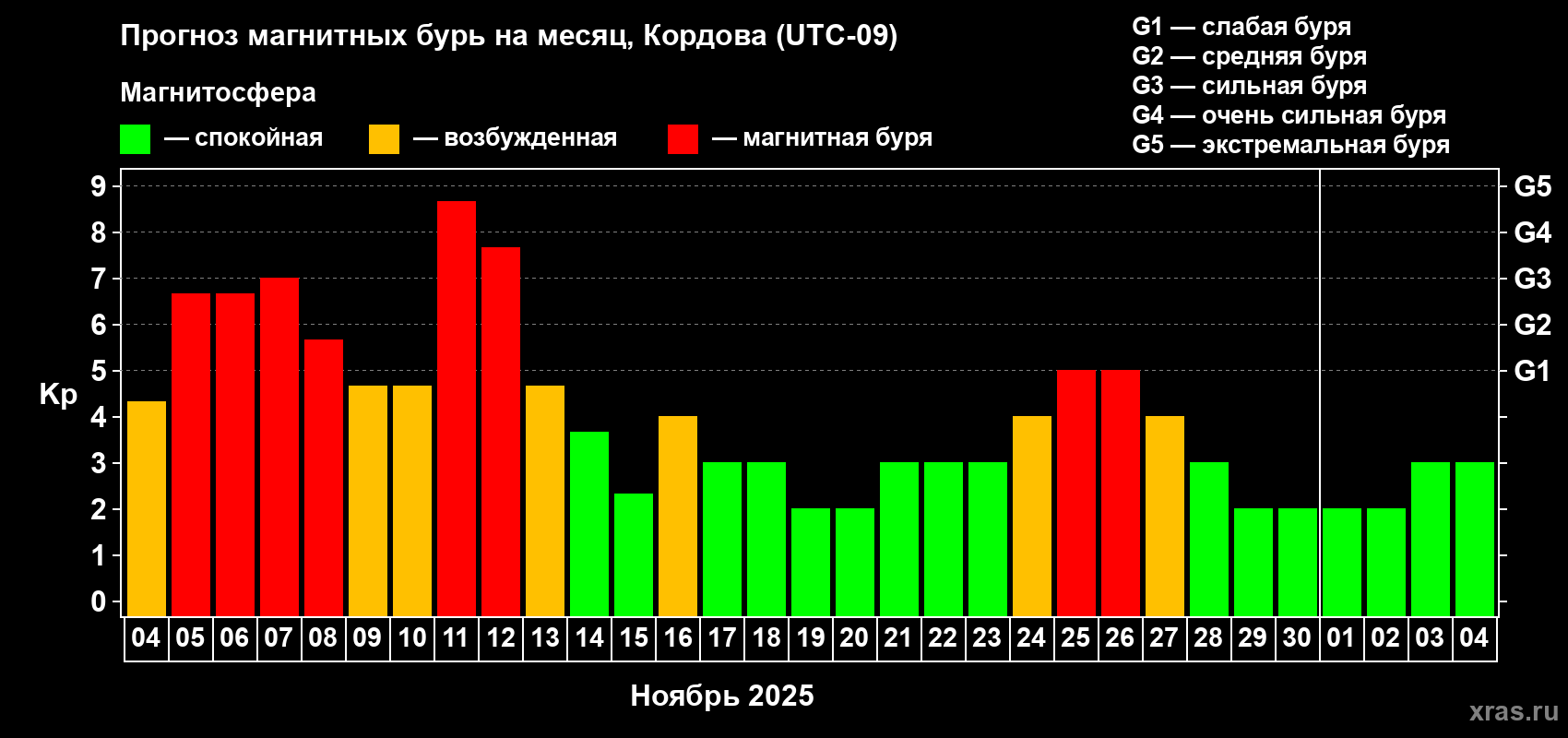 Прогноз магнитных бурь в Кордове — 4 ноября 2025 года