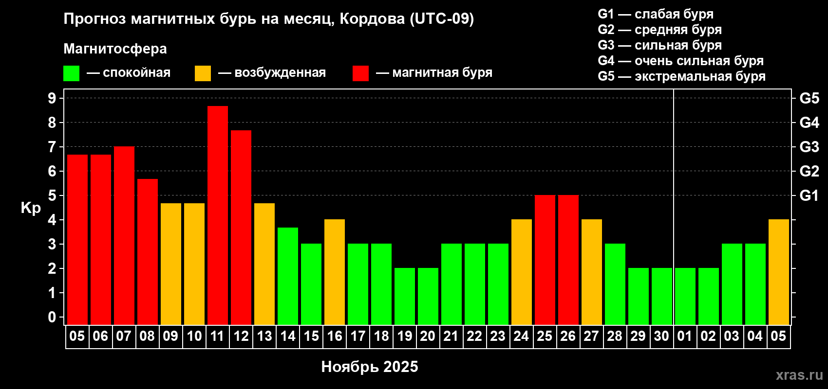 Прогноз магнитных бурь в Кордове — 5 ноября 2025 года