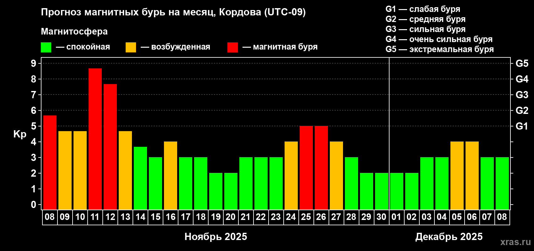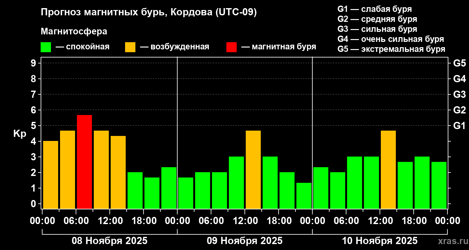 Прогноз магнитных бурь в Кордове — 8 ноября 2025 года